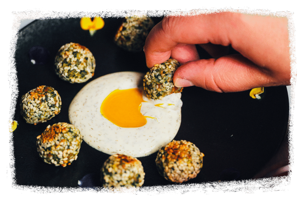 Bean Curd, Rice Wine Vinegar & Tamari, Cornmeal, Sesame Seed, Heirloom Garlic Cashew Butter, House Pickled Carrot, Cucumber & Beet (GF)(VV)